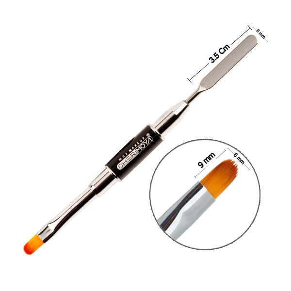 Este pincel doble función está diseñado con cerdas sintéticas de alta calidad en forma de lengua de gato y, en el extremo opuesto, una espátula metálica ideal para trabajar con powder gel. Su diseño práctico facilita el moldeado de uñas esculpidas, garantizando precisión y comodidad. Además, incluye protectores metálicos en ambos lados para mantener en perfecto estado tanto el pincel como la espátula.